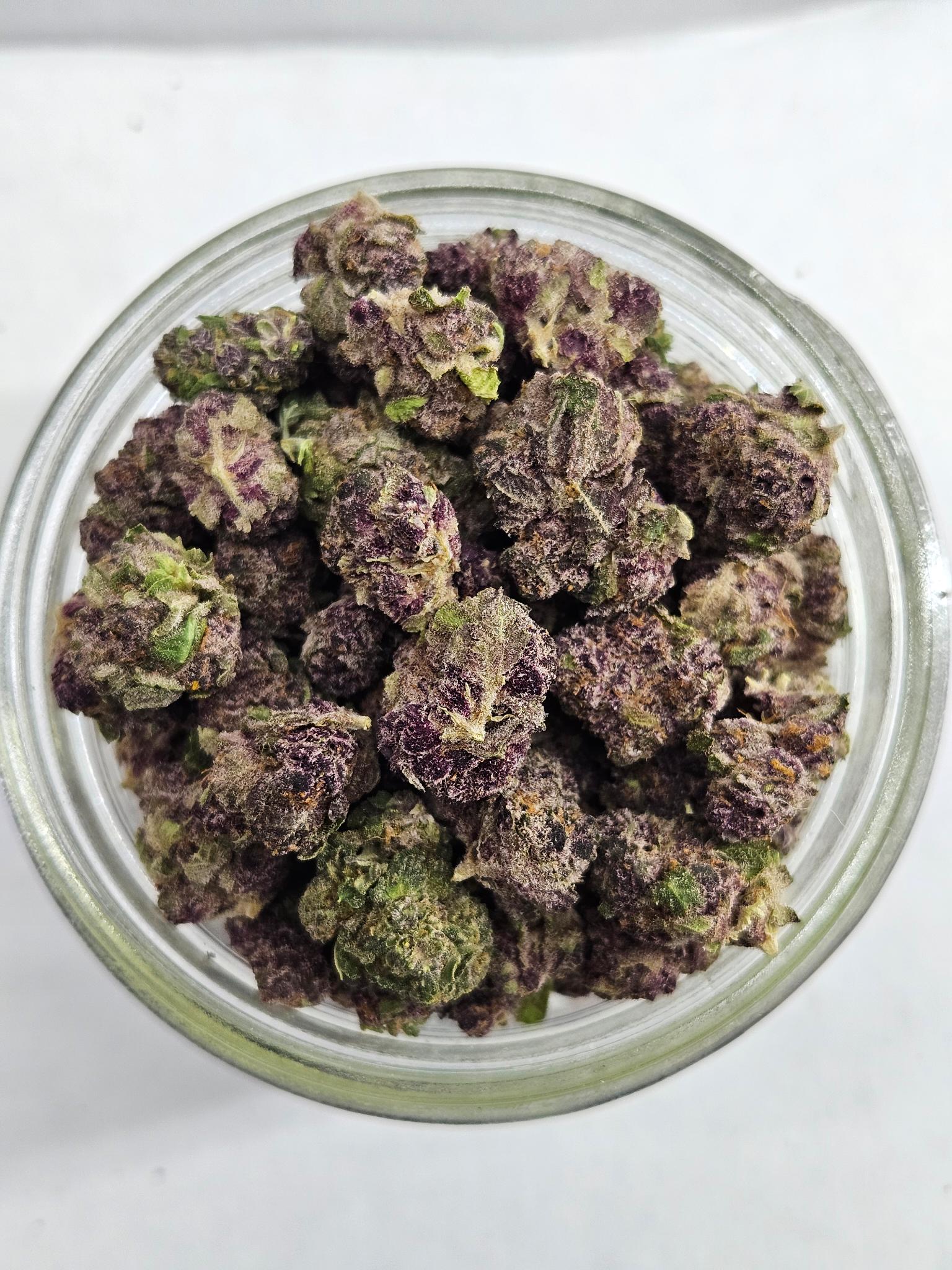 for anxiety, depression, chronic pain, and insomnia. It is characterized by its dense, olive green nugs with purple undertones and a frosty coating of white trichomes.